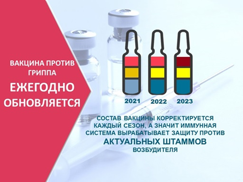 Состав вакцин на предстоящий эпидемический сезон частично изменен, Всемирной организацией здравоохранения рекомендовано включить в состав вакцины против гриппа A/Victoria/2570/2019 (H1N1)pdm09 или A/Wisconsin/588/2019 (H1N1)pdm09; A/Darwin/9/2021 (H3N2); B/Austria/1359417/2021 (B/Victorialineage); для четырехвалентных вакцин дополнительно B/Phuket/3073/2013 (B/Yamagatalineage).